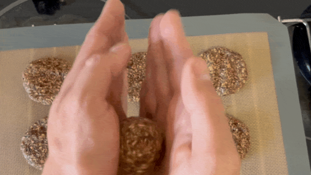 Nicht zwingend. Das Mixen hilft dabei, die Haferflocken zu zerkleinern und die Datteln zu binden, sodass die Stärke der Haferflocken den Teig zusammenhält. Ohne Mixer kannst du alles mit einem Handrührgerät, einer Gabel oder einem Löffel vermengen. Schneide die Datteln dann aber sehr fein. Wenn der Teig ohne Mixer nicht klebt, verwende „zarte“ Haferflocken statt der Vollkorn-Variante – diese nehmen Flüssigkeit besser auf.